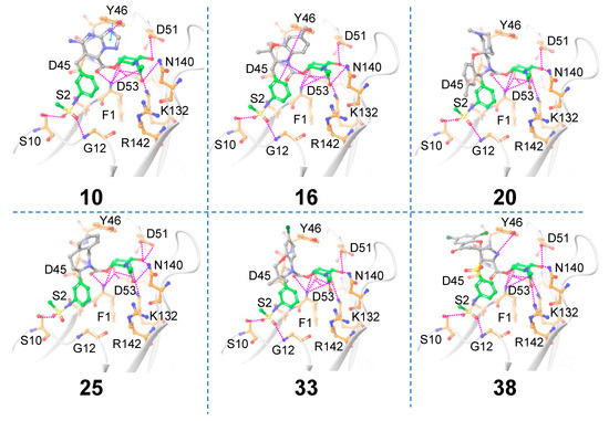 A total of 1684 core-hopping structures were obtained. Of those, 177 hits were obtained that exhibited a synthesizability score >0. We chose only those compounds that had a synthesizability score >0 and that exhibited ≥9 hydrogen bonding interactions with FmlH, which yielded 29 compounds (Table 1). The molecules that showed at least one interaction with the novel central scaffold obtained after replacement are shown in Figure 4. The FmlH–hit interactions as obtained from in silico receptor-based scaffold hopping are shown in Figure 4. For compound (a), the π–π interaction that was observed between Y46 and the most potent co-crystallized ligand [18], as well as the ligands identified by Samanta et. al. [14], was preserved (Figure 4). This π–π interaction was replaced by a cation–π interaction in ligand 16 (Figure 4). Additionally, an electrostatic interaction was observed between ligand 16 and D45 (Figure 4). In all cases, the GalNAc moiety exhibited the same complex network of hydrogen bonding interactions with FmlH residues as observed for the parent reference molecules [14]. For compounds 10, 20, 25, and 33, the GalNAc and Scaffold 1 linker moiety exhibited interactions with the FmlH binding pocket (Figure 4). The novel Scaffold 1 in ligand 38 showed a halogen bonding interaction with K97, which was not observed for the other ligands (not shown in the figure). The hits from both ligand-based and receptor-based scaffold hopping were subjected to ADMET prediction calculations. The synthesizability scores for all the hits obtained from receptor-based scaffold hopping of Scaffold 1 are summarized in Table 1.