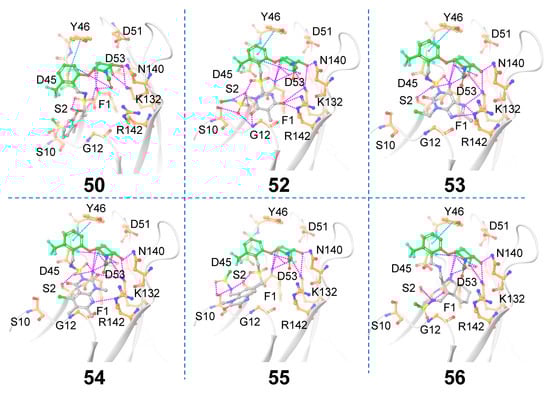 A total of 65 core hopping structures were obtained, out of which 9 hits were obtained with a synthesizability score >0, which also exhibited ≥8 hydrogen bonding interactions with FmlH (Table 2). The molecules that showed at least one interaction with the novel central scaffold were considered. The FmlH–hit interactions as obtained from in silico receptor-based scaffold hopping are shown in Figure 8. In all cases, the GalNAc moiety exhibited a complex network of hydrogen bonding interactions with FmlH residues, as observed for the parent reference molecules [14]. Hydrogen bonding interactions were observed between the FmlH binding pocket residues and the side-chain functional groups of the novel terminal scaffold. Additionally, electrostatic interactions were observed between ligand 52 and K132/R142. For ligands 50, 52, 53, 54, and 55 the linker moiety between Scaffold 1 and Scaffold 2 exhibited interactions with the FmlH binding pocket. The synthesizability scores for all the hits obtained from receptor-based scaffold hopping of Scaffold 2 are summarized in Table 2.
