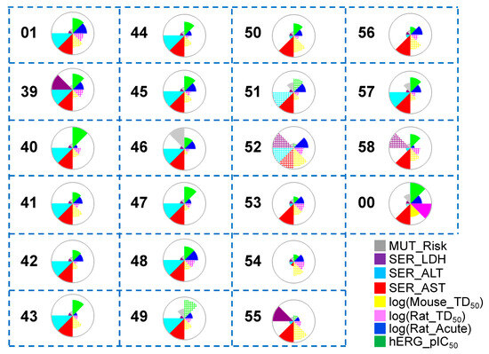 Toxicity property predictions for all the hit compounds obtained from Scaffold 1 hopping. The wedge plots show properties for the molecules calculated using machine-learning ADMET PredictorTM10.3.0.7 models. Cross-hatched wedges indicate predictions for out-of-scope molecules. The different colored wedges represent the various toxicity properties, which are indicated in the figure labels.