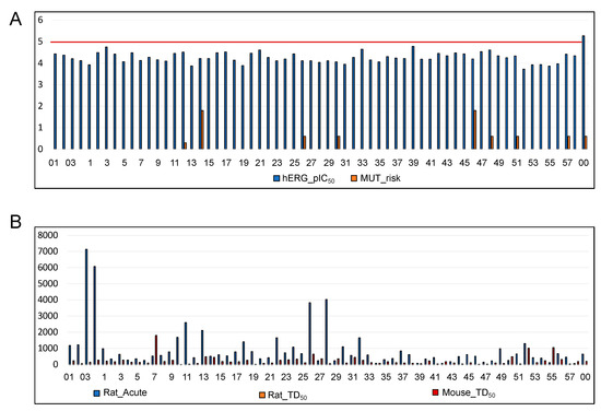 Numerical values of the predicted (A) hERG toxicity, mutagenicity risk, (B) acute rat toxicity (LD50), and Rat TD50 and Mouse TD50 values for the hits. The red line in (A) represents all the hits that exhibited hERG toxicity lower than the cut-off. The negative control (00) used in this study exhibited higher hERG toxicity. hERG_pIC50 is given in mol/L. LD50 for rat acute toxicity = mg/kg in the oral dose that would be lethal to 50% of the rats. Rat_TD50 = mg/kg/day in the oral dose. Mouse_TD50 = mg/kg/day in the oral dose.