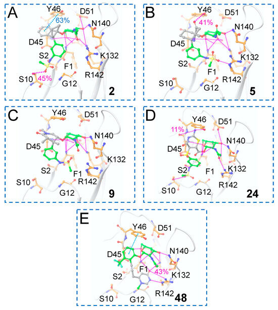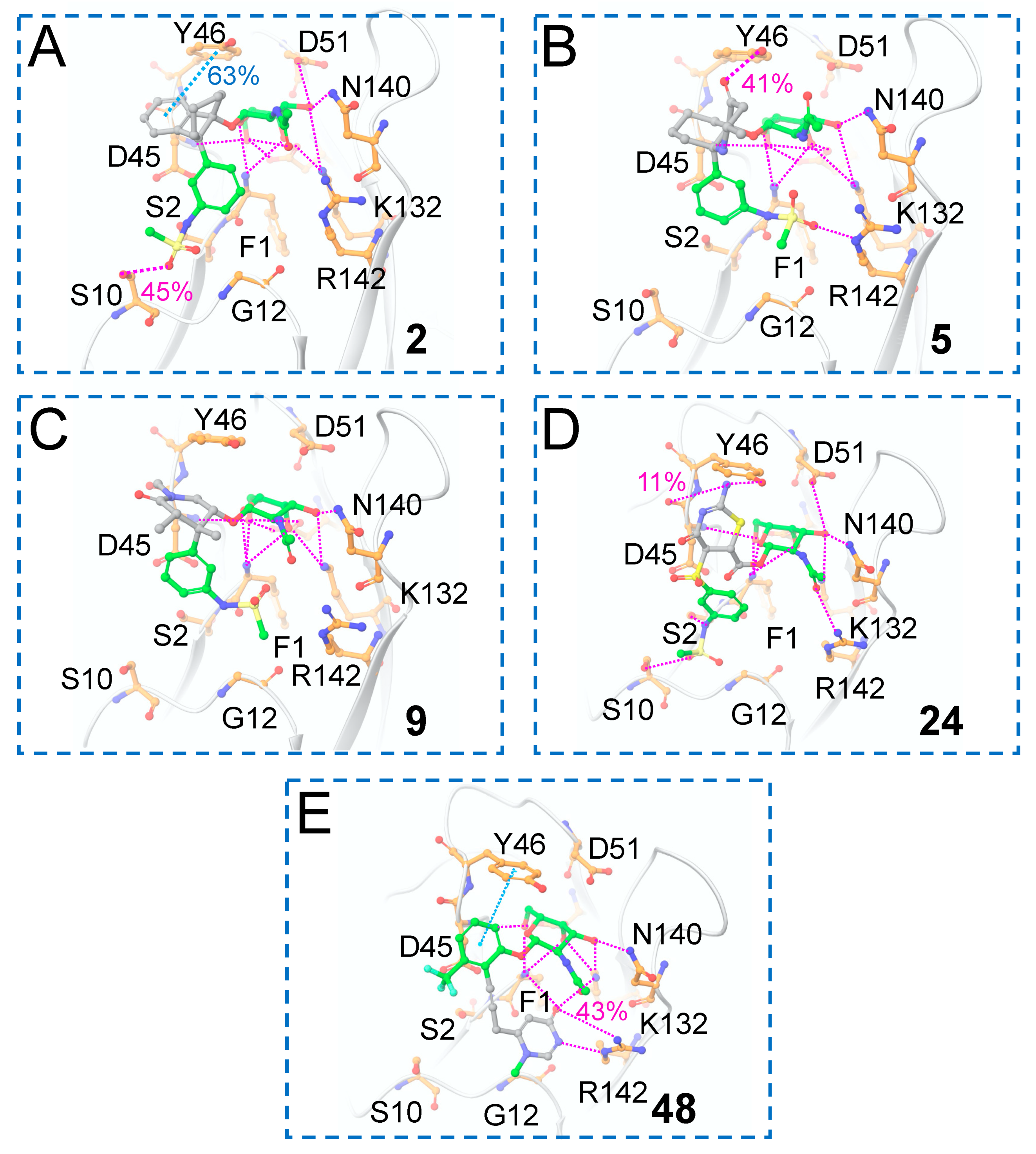 For the top hits from this work (2, 5, 9, 24, and 48), the interactions that were maintained during the 100 ns MD simulations between the ligands and FmlH are given in Figure 12. It was observed in the previous work by Samanta et al. that the most potent co-crystallized ligand did not show a π–π interaction with Y46 [14]. The novel scaffold in 2 exhibited π–π stacking with Y46, which was maintained for 63% of the simulation time (Figure 12A), a significant improvement over the most potent co-crystallized ligand [14]. In addition, a hydrogen bonding interaction was observed with the neighboring S10 residue. One of the sulfonamide oxygens of the terminal aglycone fragment interacted with the sidechain of the S10 residue in the previously reported research on FmlH-binding small molecule glycomimetics [14,18]. In molecule 5, the central novel scaffold is a non-aromatic moiety; therefore, a π–π stacking interaction with Y46 was not possible, but instead, there was hydrogen bonding of the carbonyl group with Y46. (Figure 12B). In molecule 9, a water-mediated hydrogen bonding interaction was observed between the glycosidic linkage connecting the GalNAc and the novel Scaffold 1 moiety, which was maintained for 52% of the simulation time (not shown for clarity). A hydrogen bonding interaction was found between the primary amine group in the central scaffold in molecule 24 and residue D45 (Figure 12D). D45 was previously identified as an important residue involved in polar interactions with strong FmlH-binding glycomimetics [14,18]. Finally, for molecule 48 (obtained after replacing Scaffold 2), the novel aglycone terminal scaffold exhibited a hydrogen bonding interaction with the neighboring R142 residue, which was maintained for 43% of the simulation time (Figure 12E). In all cases, a complex network of hydrogen bonding interactions between the GalNAc moiety and FmlH residues were maintained. During the molecular dynamics (MD) simulations, the top-ranked compounds did not dissociate from the binding site. The root-mean-square deviations (RMSD) of the five hits are shown in Figure S5. Compounds 5 and 9 exhibited lower RMSD variations than 2, 24, and 48 (Figure S5). All the ligands maintained low RMSD values throughout the MD simulation trajectories, indicating that they were stably bound in the FmlH binding pocket.
