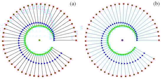 For validation, we compared the attitudes of the tethered satellite system calculated using the ANCF and two-piece dumbbell models. Figure 3a shows the attitudes derived from the ANCF model, whereas Figure 3b presents those derived from the two-piece dumbbell model [17]. In Figure 3, satellite A is depicted as a green circle, satellite B as a red square, the moving payload as a blue triangle, and the tether as a black line. The orbital direction of the satellite system was counterclockwise. For clarity when observing attitude changes, the orbital radius of satellite A is shown at its actual distance, and the length of the tether is magnified by a factor of 1000. The attitudes obtained using the ANCF model exhibited minimal deviation from those obtained using the two-piece dumbbell model in the previous study [17].