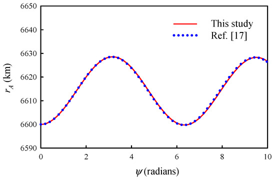 Before examining the dynamic responses of the satellite system, the responses using the proposed ANCF in this paper were verified through comparison with those obtained using the two-piece dumbbell model from a previous study [17]. When the payload speed is very low, the deflection of the tether remains relatively small. In this case, the response of the ANCF model in this study is nearly identical to that of the two-piece dumbbell model, which does not consider tether deformation. For this purpose, the payload speed was selected as 1 m/s. The material properties and dimensions used for verification were as follows: the masses of satellites A and B were 1000 kg, and the mass of the moving payload was 100 kg. The length, mass density, cross-sectional area, and Young’s modulus of the tether were 10 km, 1440 kg/m3, 2 mm2, and 131 GPa, respectively. The initial conditions for verification were 6600 km, 6610 km, , and rad/s. All material properties and dimensions were identical to those in Ref. [17], except for the density, cross-sectional area, and Young’s modulus of the tether, which were not specified in Ref. [17].