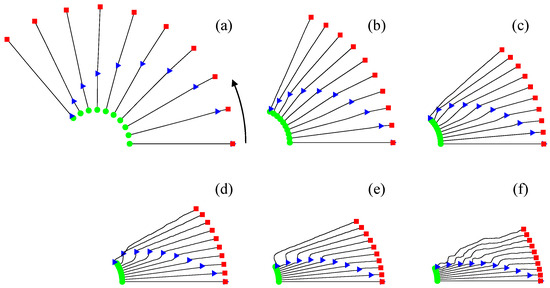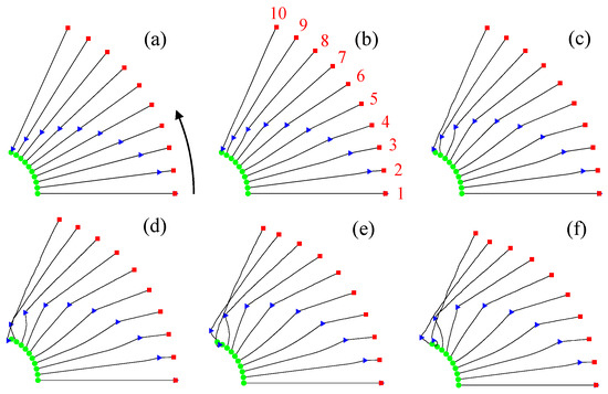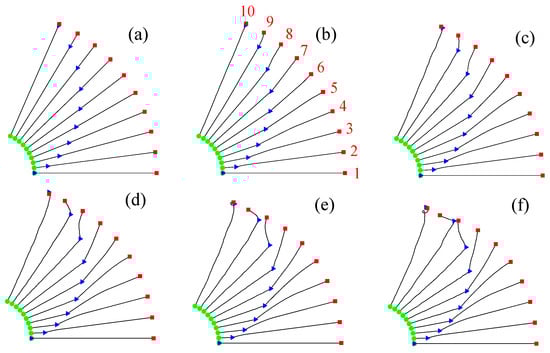 First, the influence of the payload mass on the attitude of the tethered satellite system was analyzed. The dynamic responses of the satellite system were computed for various payload masses when the payload moved at 20 m/s, as shown in Figure 6. In Figure 6, similar to Figure 3, satellite A is represented by a green circle, satellite B by a red square, the moving payload by a blue triangle, and the tether by a black line. These symbols are used to describe the attitudes of the tethered satellite system with a moving payload in subsequent discussions. The changes in the attitude of the tethered satellite system during the transfer of the payload from satellite A to satellite B for various payload masses () of 10, 100, 200, 300, 400, and 500 kg are shown in Figure 6a,b,c,d,e,f, respectively. The attitudes of the satellite system at 10 different moments, spaced at equal time intervals during the transfer, are illustrated in Figure 6. The satellite system orbits the Earth in a counterclockwise direction, as indicated by the arrow in Figure 6a. When the payload mass was relatively small ( 10 kg), the tethers appeared almost straight, as shown in Figure 6a. However, as the payload mass increased, the tether deformation became more pronounced, as shown in Figure 6b–f. The payload moved clockwise relative to the line connecting satellites A and B, in contrast to the counterclockwise orbital motion. For relatively large payload masses, as shown in Figure 6e and f, the tether deformations become significant. As the payload approaches satellite B, the deformation becomes so severe that the tether experiences slack and rebound due to the payload’s tumbling, resulting in an unstable attitude.