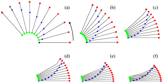 Attitudes of tethered satellites for different payload masses as the payload moves from satellite B to satellite A: (a) 10 kg, (b) 100 kg, (c) 200 kg, (d) 300 kg, (e) 400 kg, and (f) 500 kg. The green circle, red square, and blue triangle represent satellite A, satellite B, and the payload, respectively.