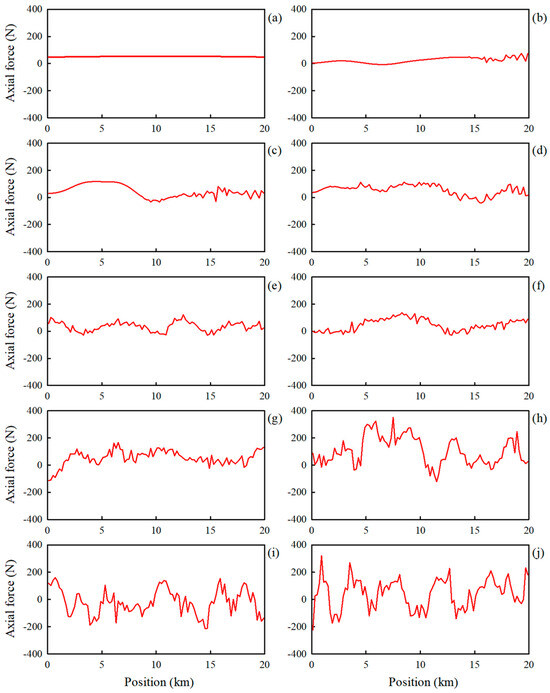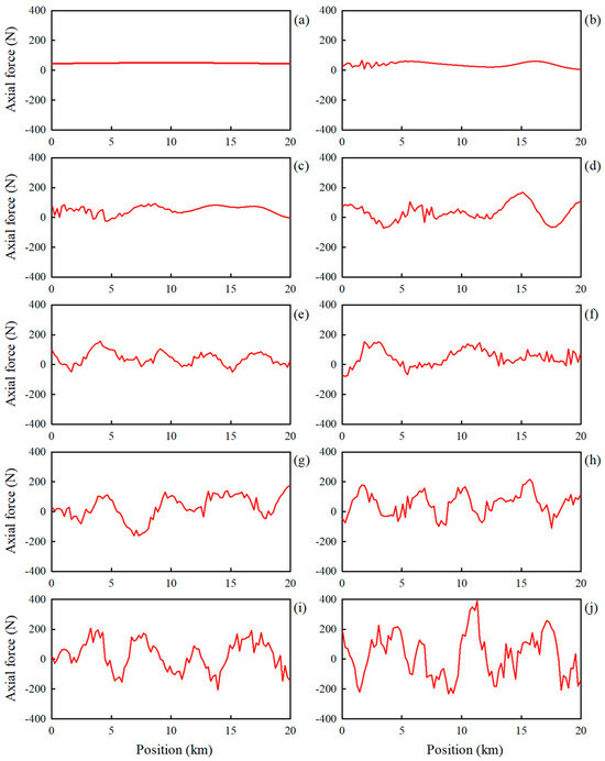 Axial forces in the tether for various attitudes shown in Figure 6b: (a) attitude 1, (b) attitude 2, (c) attitude 3, (d) attitude 4, (e) attitude 5, (f) attitude 6, (g) attitude 7, (h) attitude 8, (i) attitude 9, and (j) attitude 10.