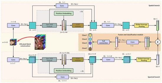 Since the emergence of deep learning in 2006, extensive research and application have been conducted in computer vision and remote sensing science []. The widespread use of deep learning methodologies in hyperspectral image classification has shown improved performance compared to traditional machine learning approaches []. Various studies have demonstrated the exceptional classification performance of the convolutional neural network (CNN) in hyperspectral image classification [,,,]. Li et al. [] proposed leveraging spectral features for hyperspectral image classification by employing CNNs to classify pairs of pixels comprising central and surrounding pixels. Hyperspectral images not only contain abundant spectral information but also encompass crucial spatial features. In order to enhance the integration and utilization of spectral features, Zhong et al. [] initially extracted spectral features before spatial features and deepened the network through residual connections to extract more profound contextual information. Moreover, Li et al. [] developed a dual-branch attention mechanism network to separately extract spectral and spatial features, thereby preventing mutual influence between the two during extraction. Additionally, Ye et al. [] applied a multi-scale spectral-spatial joint network to extract features at various granularities, enhancing the performance of hyperspectral image classification. Fu et al. [] achieved promising results in small-sample hyperspectral image classification by utilizing a dual-branch structure to extract multiscale spatial and spectral information.