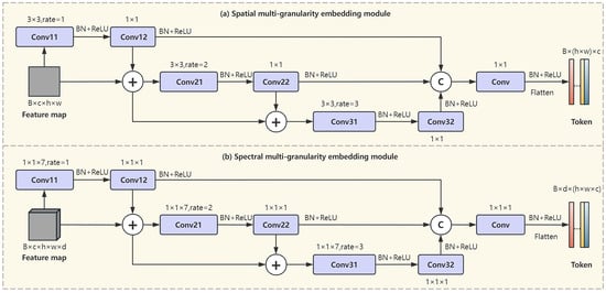 Fusion and Transformation: The outputs from the three branches, , , and , are concatenated and subsequently processed through a convolution, followed by BN and ReLU, resulting in . The dimensions of the feature map are then transformed through a Rearrange operation to yield the spectral embedded token . Consequently, the output , where d indicates the number of spectral embedded tokens, reflects the size of the feature map’s spectral dimension, while denotes the token dimension of spectral embedding, as illustrated in the lower part of Figure 2.