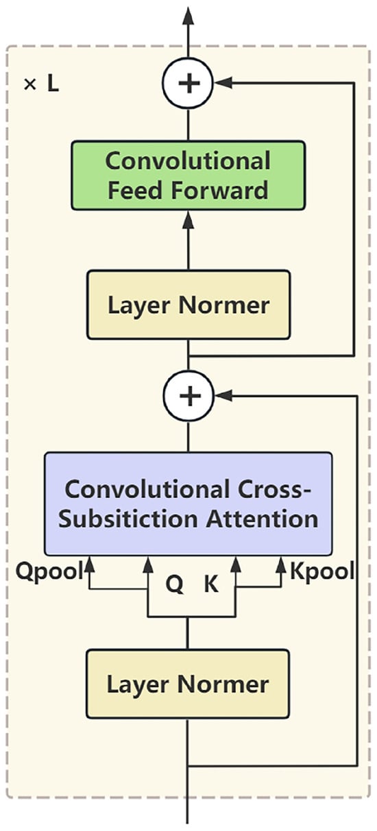 The convolutional cross-substitution Transformer module comprises two residual connections, two normalization layers, a convolutional cross-substitution attention layer, and a convolutional feedforward network layer, as illustrated in Figure 3. Within this framework, layer normalization is employed to standardize the input data, which stabilizes the model training process, mitigates internal covariate shifts, and enhances the model’s generalization capability as well as its convergence speed. The convolutional cross-substitution attention block serves as a fundamental innovative component of this module, integrating convolutional operations with a cross-substitution attention mechanism. This integration facilitates the efficient extraction and processing of features from hyperspectral images. The convolutional feedforward network layer leverages convolutional operations as a feedforward layer, thereby enabling the extraction of deeper-level features.