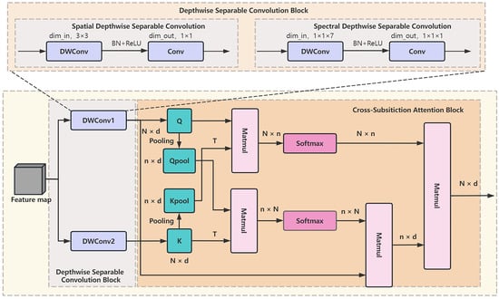 During the projection phase, instead of employing conventional self-attention modules, depthwise separable convolutions are utilized to perform the projection operations for local feature extraction. As illustrated in the upper portion of Figure 4, this study implements depthwise separable convolutions with a kernel size of for spatial feature projection, while for the spectral dimension, depthwise separable convolutions with a kernel size of are employed for spectral feature projection. Notably, in comparison to conventional convolutions, depthwise separable convolutions significantly reduce computational costs. For instance, considering a token with dimensions , where N denotes the number of tokens to be processed and d represents the channel dimension of each token with a convolution kernel size , the parameter count in standard convolution would be , resulting in a computational load of FLOPs. Conversely, with depthwise separable convolution (which consists of depthwise and pointwise convolutions), the parameter count is reduced to , leading to a computational load of FLOPs.