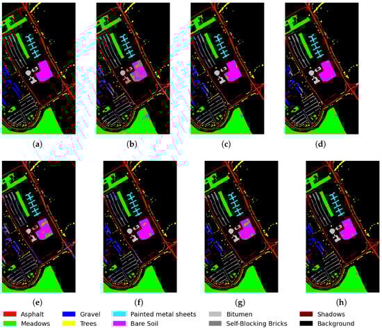 Classification maps for PU dataset: (a) ground-truth map; (b) SVM; (c) DBDA; (d) SSRN; (e) CS2DT and (f) G_A; (g) MSTViT; (h) proposed method.