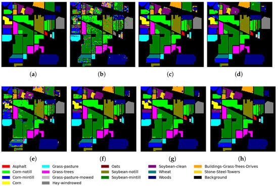 Classification maps for IP dataset: (a) ground-truth map; (b) SVM; (c) DBDA; (d) SSRN; (e) CS2DT and (f) G_A; (g) MSTViT; (h) proposed method.