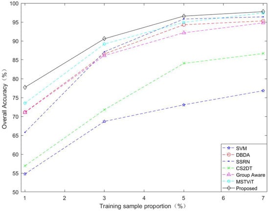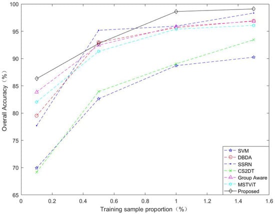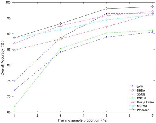 In order to assess the resilience and consistency of the proposed method, we evaluate the classification performance under different proportions of training samples across the datasets. Specifically, 0.1%, 0.5%, 1%, and 1.5% of labeled samples from the PU dataset are utilized as training sets. Similarly, 1%, 3%, 5%, and 7% of the labeled samples are employed as training sets in the IP and KSC datasets.