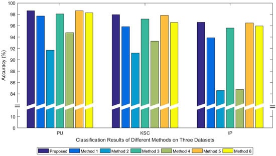 The comparative results of the ablation experiments across different datasets are illustrated in Figure 12. First, the comparison of the dual-branch method employed in this study with the results from Method 1 and Method 2 validated the effectiveness of the dual-branch structure. The results indicate that relying solely on either spectral or spatial information yields significantly inferior classification performance relative to the integrated dual-branch structure. This finding underscores the importance of combining spectral and spatial information to enhance classification accuracy through the utilization of complementary data. Furthermore, the experimental outcomes associated with Method 3 corroborated the effectiveness of the proposed multi-granularity embedding module. This module has proven to be instrumental in capturing feature information across various scales and levels, thereby enhancing the model’s representational capability and ultimately improving classification performance. Additionally, comparisons with Method 4 revealed that the traditional linear attention mechanism did not surpass the performance of our proposed approach. The proposed attention mechanism effectively integrates local and global features while emphasizing essential information, thereby enhancing the model’s ability to amalgamate information and improving classification accuracy. The comparison between Method 5 and our proposed approach demonstrated that, despite the increased computational load associated with Method 5, the results were comparable to those of our method. This outcome indicates that the proposed approach for sharing projected values successfully reduces computational complexity without compromising the model’s stability and classification efficiency. Moreover, comparing Method 6 with our proposed approach indicated a decline in classification performance, highlighting the critical importance of residual connections. Residual connections assist in mitigating the vanishing gradient problem, facilitating information flow, and enhancing model stability, which ultimately bolsters both feature representation and classification capability. Furthermore, the differential impact of each module on classification performance across the datasets suggests the influence of factors such as data distribution, noise levels, and feature complexity. Thus, selecting a suitable combination of modules and parameter settings tailored to the specific characteristics of the dataset is essential for achieving optimal performance.
