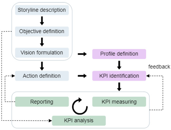 KPIs have a long-standing presence in business management, functioning as essential tools for translating organizational strategy into measurable actions. KPIs serve as guides toward achieving objectives, since they represent the quantifiable aspects of the project’s strategic goals, ensuring alignment with the overarching mission of urban transformation. To achieve operational success, a framework for the definition, monitoring, and evaluation of KPIs is defined as illustrated in Figure 1.