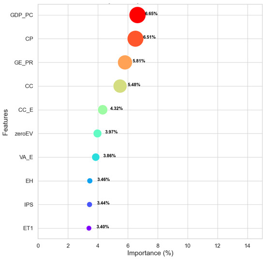 This study applies the aforementioned clustering algorithm to a dataset that includes socioeconomic and environmental indicators from several European countries. This approach allows the identification of homogeneous clusters, facilitating the analysis of patterns and trends within each group. Incremental principal component analysis (PCA) was applied to the data to reduce the data dimensionality. PCA helps to identify the main influencing factors by extracting relevant characteristics and eliminating redundant parameters that do not contribute significantly to decision-making [39]. This technique improves the analysis by focusing on the variables with the greatest impact. This study revealed that most of the variability in the data was captured in the first four principal components. For visualization purposes, the dimensionality was reduced to two components. This reduction helps to represent the clusters in a two-dimensional space clearly. To carry out the analysis of which KPIs have most influenced the construction of the clusters, the importance of each of the 57 KPIs was evaluated, identifying the ten most relevant. Figure 5 shows the most important KPIs and their relative percentage of importance. Some of the KPIs that stand out are GDP per capita (GDP_PC), corruption perception index (CP), and contribution to the international commitment of USD 100 billion in climate-related expenditures (CC), which have the highest impact on cluster formation compared to the other KPIs.
