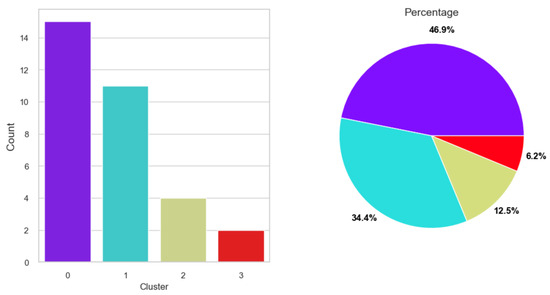 Figure 6 shows the distribution of the countries within each cluster. The bar chart on the left illustrates the number of countries in each cluster, while the pie chart on the right displays the percentage distribution. Cluster 0 contains 14 countries, representing of the total. Cluster 1 comprises 10 countries, accounting for . Cluster 2 has 4 countries, making up , and Cluster 3 consists of 2 countries, representing of the total.