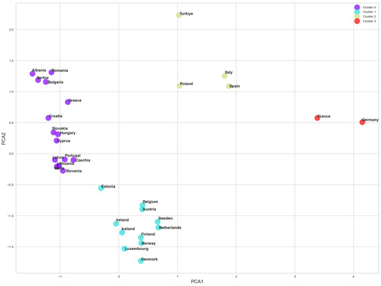 Figure 7 shows the projection of the countries in a two-dimensional space using PCA. This representation allows visualizing the dispersion and grouping of the countries according to the identified clusters. The axes of the graph represent the first two principal components, which explain most of the variability in the data. Cluster 0 includes 15 countries mainly from Central and Eastern Europe, such as Bulgaria, Czech Republic, Greece, Croatia, Cyprus, Latvia, Lithuania, Hungary, Malta, Portugal, Romania, Slovenia, Slovakia, Albania and Serbia. These countries present characteristics of moderate development. GDP per capita values vary, with urbanization levels reflecting progress toward modernization. Indicators of access to drinking water and sanitation are also diverse, with some countries reaching almost full coverage, while others are still developing. Expected years of education and governance levels show moderate values, suggesting areas for improvement in infrastructure and public services.