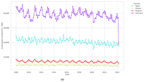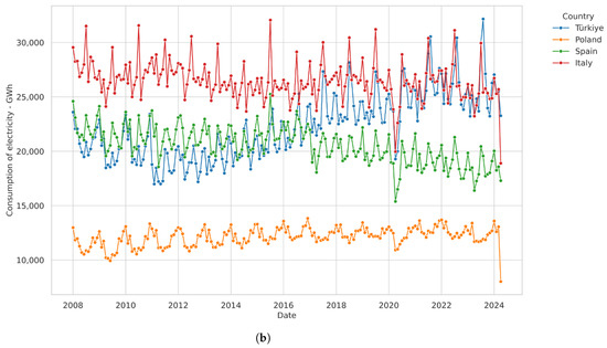The defined clusters of the countries using the ML technique match the perspective of the countries’ differences and similarities. The KPI values at the specified time, the year 2021, are used as the base for the definition of the clusters. These clusters represent the result of different decisions made in the context of urban planning and design in the last decades. Realized decisions are translated into KPI value changes in the subsequent years. Thus, the KPI values for months from January 2008 to May 2024 (https://ec.europa.eu/eurostat/web/main/data/database, accessed on 27 September 2024) are tracked and demonstrated in Figure 8 and Figure 9. The time series analysis of various KPIs reveals significant trends and patterns. The electricity consumption trends depicted in Figure 8a show that Germany maintains significantly higher levels compared to Greece, Belgium, and Spain. This disparity reflects differences in economic scale and the extent of electrification and industrialization. In Figure 8b, a comparison of electricity consumption within Cluster 2 countries (Turkey, Poland, Spain, and Italy) reveals that Italy and Spain not only consume more electricity but also exhibit greater fluctuations, pointing to a more dynamic industrial sector and varying electricity demand throughout the year. The consistently higher consumption levels in Italy and Spain emphasize the importance of investing in renewable energy sources and improving energy efficiency to meet sustainability goals and reduce dependency on fossil fuels.