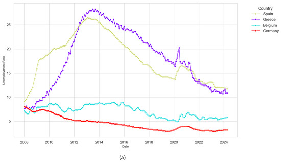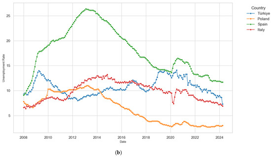 Unemployment trends, as shown in Figure 9a, highlight the socioeconomic challenges faced by different clusters. Spain and Greece, both severely affected by the 2008 financial crisis, experienced high unemployment rates that gradually decreased over the years. Belgium’s more stable and lower unemployment rates contrast sharply, indicating more resilient labor markets. In Figure 9b, the comparison within Cluster 2 countries reveals that Spain consistently faced the highest unemployment challenges compared to Turkey, Poland, and Italy, reflecting structural issues within its labor market. These insights are crucial for formulating targeted employment policies and economic reforms to enhance job creation and labor market stability.