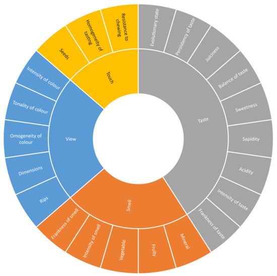 The sensory profiles of the tomatoes were determined by members of an “expert panel” of the University of Pisa, as described by Cela et al. [27]. Concerning the training process, the method was validated in accordance with Billeci et al. [31], the Good Senses commercial procedure [32], and Marchioni et al. [33]. The panellists settled on a final set of 24 descriptive indicators that included both quantitative and hedonic attributes. They also created a novel sensory wheel that was customized for tomato tasting, as described by Cela et al. [27] (Figure 1).