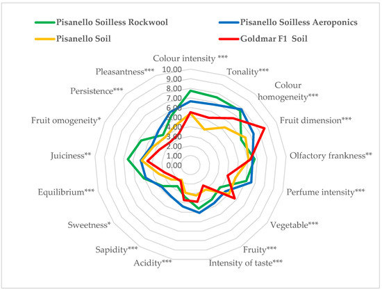 Sensory profile analysis comparison between Pisanello soilless rockwool, Pisanello soilless aeroponics, Pisanello soil, and Goldmar F1 soil. Significance level (*** p < 0.001, ** p < 0.01, * p < 0.05) is based on ANOVA and Tukey post hoc test performed between treatments.