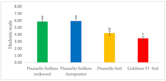 Overall, the sensory evaluation results suggested that Pisanello tomatoes cultivated using aeroponics received the highest scores in most attributes, closely followed by Pisanello tomatoes cultivated using the rockwool soilless system (Figure 3). Although Pisanello tomatoes achieved superior scores to Goldmar F1 soil-grown tomatoes, which had the lowest sensory profile scores, the Pisanello tomatoes grown in soil were less appreciated in comparison with the soilless treatments (Figure 4).
