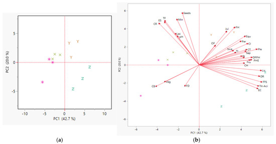 Principal Component Analysis (a) and biplot (b) of tomato varieties. 1: Pisanello soilless1; 2: Pisanello soilless2; 3: Pisanello soilless3; 4: Pisanello soil1; 5: Pisanello soil2; 6: Pisanello soil3; 7: Pisanello aeroponics1; 8: Pisanello aeroponics2; 9: Pisanello aeroponics3; 10: GoldmarF1−1: 11: Goldmar F1−2; 12: Goldmar F1−3. *: Goldmar−F; X: Pisanello soil; Y: Pisanello soilless rockwool; Z: Pisanello aeroponics; CB: consistence of berries; Veg: vegetal; FD: fruit dimension; EC: electrical conductivity; Tit-Aci: titratable acidity; TTS: total soluble solids; DR: dry residue; Lic: lycopene; CH: colour homogeneity; Fru: fruit; PHE: total phenols; PI: perfume intensity; Sap: sapidity; Ple: pleasance; CT: colour tonality; TI: taste intensity; Swe: sweetness; Per: persistence; Equ: equilibrium; OF: Olfactive frankness; Jui: juiciness; FH: fruit homogeneity; CI: colour intensity; Seeds: presence of seeds; Min: mineral; Lac: presence of lacerations; TF: taste frankness; ES: evolutionary state; CR: chewing resistance; DPPH: antioxidant activity by DPPH assay.