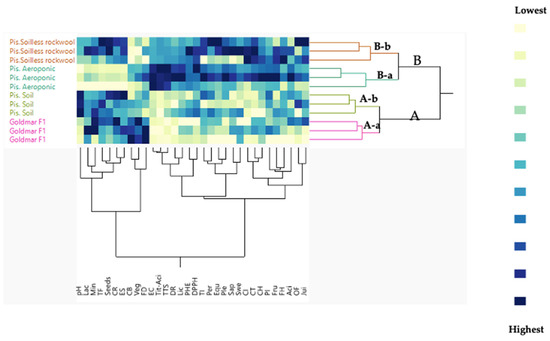 These clusters were subsequently subdivided into subclusters: subcluster A-a, comprising the Goldmar F1 tomatoes, and subcluster A-b, consisting of the Pisanello tomatoes (Figure 6). Similarly, the soilless group was divided into subcluster B-a, containing two Pisanello aeroponically cultivated samples and one soilless sample, and subcluster B-b, encompassing the remaining soilless samples.
