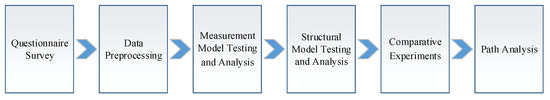 Figure 3 shows the flowchart of tendentious information dissemination analysis. A questionnaire survey was used to collect the data. Data preprocessing was used to conduct the preliminary analysis of the data. The testing and analysis of the measurement model and the structural model, along with the comparative experimental analysis, completed the construction of the model. Path analysis realized the in-depth analysis of the model.