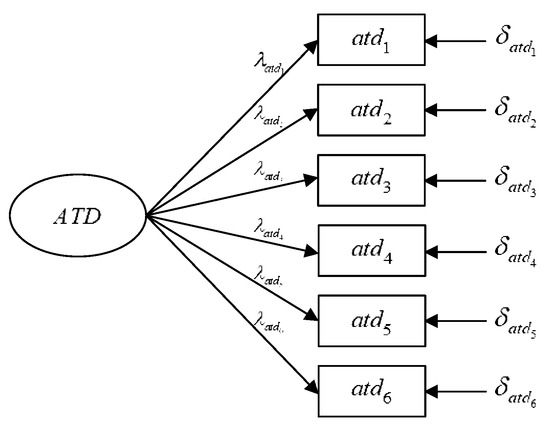 Based on the foregoing, this study conducted CFA on each of the seven indicators of tendentious information dissemination in cyberspace. Figure 4 illustrates the measurement model using the latent variable of ATD as an example. In Figure 4, represents the six observed variables measuring the latent variable (ATD), is the factor loading amount of each observed variable, and is the measurement error generated by each observed variable in estimating the latent variable (ATD). Similarly, eight observed variables were used to measure SND, IDB, ISO, and DTR, and seven observed variables were used to measure PBC and IDI. A total of 52 measurement items were used as observed variables in the questionnaire. The reliability and validity of the entire measurement questionnaire were tested based on a CFA of the single measurement model.
