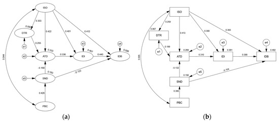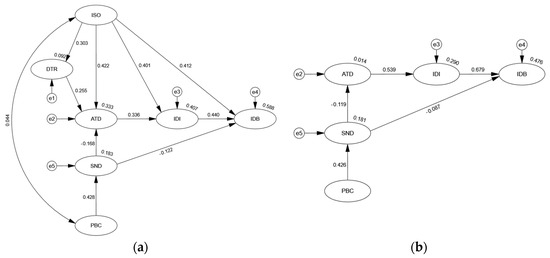 Table 14 presents the path analysis results for ATD. As Table 14 shows, the C.R. values of ISO, DTR, and SND were all greater than 1.96 and the p-values were less than 0.01, indicating that the three independent variables had significant effects on ATD. Among them, ISO and DTR had significant positive effects on the dependent variables, with effects of 0.422 and 0.255, respectively. SND had a significant negative effect on the dependent variable, with an effect of −0.168. Combined with Figure 5, the model explains 33.3% of the variance variation of ATD, reaching a moderate explanatory power that is far above the level of reasonable explanation. According to these results, the greater the emotional tendency of the information content itself or the stronger the trust relationship between the communication nodes, the more likely the information receiver will have a positive attitude toward re-dissemination. Moreover, a stronger awareness of various basic norms of tendentious information dissemination will inhibit the enthusiasm of the information receiver toward re-dissemination. Overall, the attitude of information dissemination nodes toward transferable information depends more on the emotional tendency of the information content itself. This essential attribute of information is an important key factor influencing the attitude toward information re-dissemination.