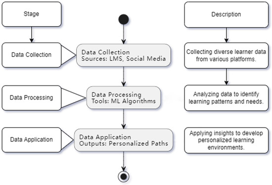 Big data plays several roles in personalized learning systems [21]. First, it allows for collecting and processing big sets of information from different sources, including digital books, online forums, and media files. This data integration offers a complete picture of the learner’s engagement with the material and other students, which leads to a more detailed understanding of learning behaviors and preferences. As an example, interaction data can be used by language learning platforms to spot patterns in language acquisition, like frequent mistakes or topics that learners find especially difficult or amusing.