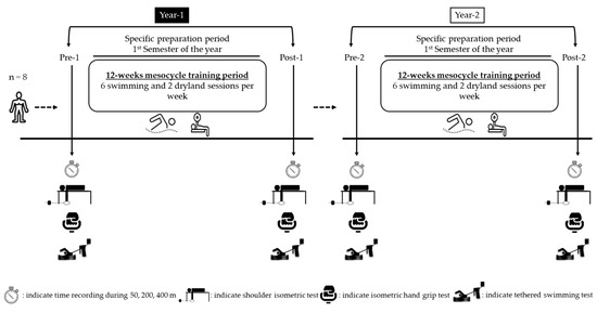 A one-group repeated-measure design was applied with pre-training and post-training period measurements during two consecutive annual training cycles. Pre and post measurements in both years were applied during the same 12-week mesocycle of a specific preparation training period. Swimmers were tested in four time points, two for each training cycle, before (Pre) and after (Post) a 12-week training period (Year-1: Pre-1 and Post-1 vs. Year-2: Pre-2 and Post-2; Figure 1). All tests as well as training sessions were completed at the same time of the day (6:00 to 8:00 p.m.) in a 50 m outdoor swimming pool with a water temperature of 27 °C. Ambient temperature during testing ranged between 28 and 30 °C.