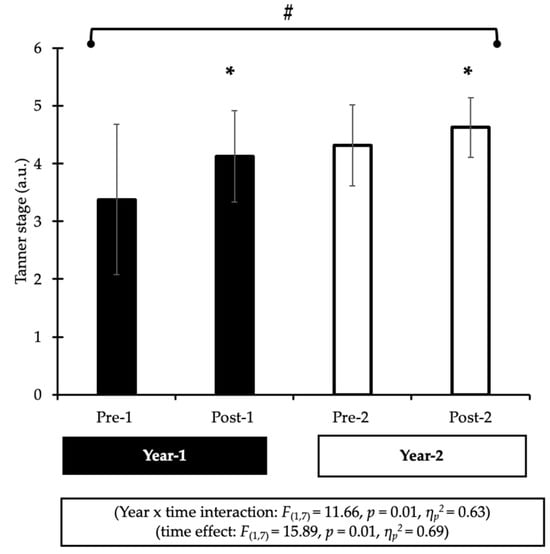 Swimmers’ biological maturity changes according to Tanner stage in Year-1 and Year-2 and pre- (Pre-1, Pre-2) to post-training (Post-1, Post-2) measurements. *: p > 0.05, Pre-1 vs. Post-1 and Pre-2 vs. Post-2; #: p > 0.05, Pre-1 vs. Pre-2 and Post-1 vs. Post-2.