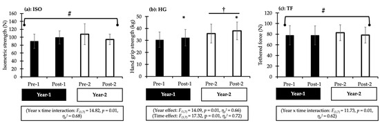 Shoulder isometric strength [ISO, panel (a)], hand grip isometric strength [HG, panel (b)], and tethered force [TF, panel (c)] changes in Year-1 and Year-2 for pre- and post-training measurements (Pre-1, Post-1, Pre-2, and Post-2). * p < 0.05, Post-1 vs. Pre-1 and Post-2 vs. Pre-2; # p < 0.05, Pre-2 compared to Pre-1 for ISO and TF and Post-2 compared to Post-1 for TF; † p < 0.05, Year-1 vs. Year-2.
