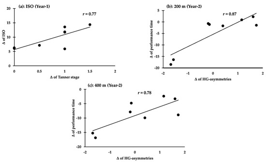 Correlations of Δ values of swimmer’s Tanner stage with ISO in Year-1 [panel (a)] and 200 and 400 m changes with Δ of asymmetries evaluated by HG test in Year-2 [200 m, panel (b); 400 m, panel (c)].