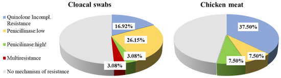 - Caruso, G.; Giammanco, A.; Cardamone, C.; Oliveri, G.; Mascarella, C.; Capra, G.; Fasciana, T. Extra-intestinal fluoroquinolone-resistant Escherichia coli strains isolated from meat. Biomed. Res. Int. 2018, 2018, 8714975. [Google Scholar] [CrossRef] [PubMed]