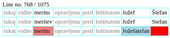 In Figure 2, we see the concatenation of two words in the normalization, resulting in two errors detected by the evaluation tool: a wrong conversion and a deleted word error (W-del). In Figure 3, we see that the word s (eng. with) was an inserted word error (W-Ins), and the word kolektorji (eng. collectors) was deleted. Inserted and deleted words are highlighted in bright red in the HTML outputs and are mostly observed with transformer models, while statistical and LSTM models favor one-to-one conversions.