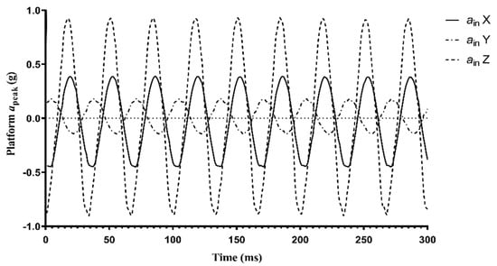 The LVP is equipped with one rotational motor (0.18 kW; 3000 rpm) attached under the LVP capable of generating harmonic vibrations of 20, 25, or 30 Hz. These frequencies can be pre-selected on the device. As the motor rotates on the x-axis, it generates harmonic vibrations in mainly the y- and z-axes [] (Figure 2). Thus, the LVP is a synchronous vibration platform [,,].