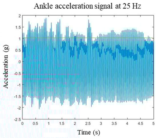 Raw accelerometery data with removed gravitational forces were acquired from each WIMU and downloaded via SPRO software (Realtrack Systems, Almeria, Spain, https://www.hudl.com/en_gb/products/wimu). The high-frequency noise of the signals was removed using a 2nd-order low-pass Butterworth filter with a cut-off frequency of 120 Hz. Data from the first 10 s were dismissed for each 30 s trial to ensure a stationary vibration signal. A 5 s window of the signal from the 10 s mark was selected and processed to obtain the analysed parameters [].