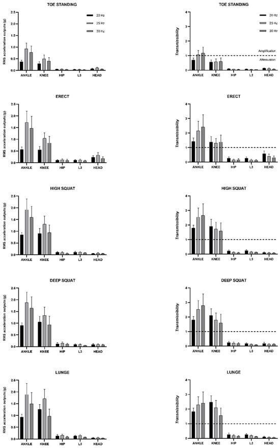 An experimental study with repeated cross-over design was adopted. Thus, both the LVP inputs and its transmission outputs to the human body were recorded simultaneously across fifteen trials generated by the combination of three (20, 25, and 30 Hz), and five static postures [,]. The postures were toe-standing (TS), with knees relaxed and heels raised; erect (ER), with knees relaxed; high squat (HS), with knee flexion at 30°; deep squat (DS), with knee flexion at 90°; and lunge (LU), one leg balanced with knee flexion at 30°. These postures were chosen because they are the most common in the literature [,,,,]. All the postures were performed without holding help, however, as participants had experience with the postures used, they were able to adopt the postures safely. Nevertheless, the three researchers were careful in ensuring the safety and correct posture of the participants. As is customary in transmission studies, the participants were barefoot [,,,], and they were instructed to locate their feet on the platform marks separated by 28 cm [] and to maintain an even distribution of plantar pressure [,]. The participants visited the laboratory on one occasion, and the experimental protocol began with 5 min of familiarisation with the vibration stimulus and postures (1 min × posture at 30 Hz), which served as a warm-up [,,,]. After the warm-up, 5 min of rest was used for the WIMUs’ attachment, which were well-fixed with elastic bands to the body sites. Then, fifteen experimental bouts were recorded and counterbalanced, which were organised in three sets of five bouts. Each bout of WBV exposure lasted 30 s (s) followed by 30 s of rest between bouts, and 3 min of rest between sets to avoid fatigue in the participants. To determine LVP feasibility, both its performance and its transmission were explored through assessed vibrations applied by the platform across three frequencies (20, 25, and 30 Hz) and five postures (TS, ER, HS, DS, and LU). On the one side, the performance of the LVP was characterised through its inputs of , , , and ; on the other side, the transmissions to the human body were characterised through the outputs of , , and at AN, KN, HI, L3, and HE.