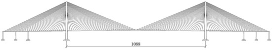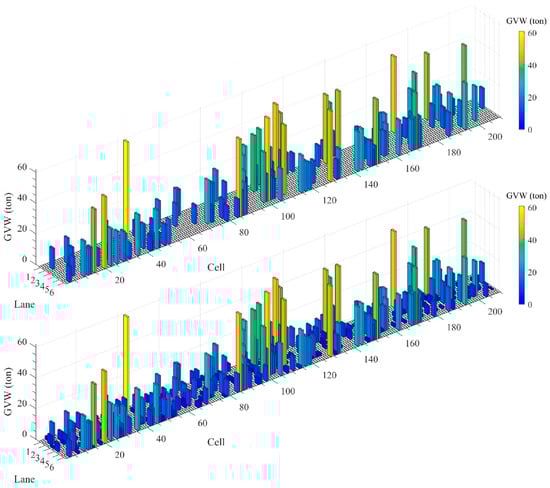 According to Chen et al. [37], the average total axle length of heavy vehicles in China is 15.13 m (from the first axle to the last axle). Considering the length of the front and rear trailers and the necessary following distance during driving, the bridge deck cell length in the authors’ previous study was set to 20 m for free-flow traffic.