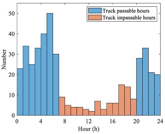 To simulate the congested traffic flow on long-span bridges, the traffic flow WIM data at the site of a real operational long-span cable-stayed bridge in China, with a span length of 1088 m, was investigated, as shown in Figure 2. From the WIM measurement of 423 days of free-flow traffic, 423 daily extreme response scenarios (i.e., the maximum-per-day event of the effect of the cable force of the investigated bridge) of free flow were obtained from WIM data as the sample for the further simulation of extreme response scenario in free-flow conditions. The point in time at which these 423 samples achieved the maxima (i.e., the response extremes achieved at the points of the day, on a 24 h basis) were further counted, as shown in Figure 3. It can be seen that most of the extreme response scenarios occurred between 20:00 pm and 7:00 am the next day, and only a small number of extreme response scenarios (86 in total) occurred during the daytime hours. Common sense dictates that trucks tend to travel at night. At the same time, almost all large cities in the vicinity of the WIM site are closed to truck traffic during daytime hours, even though there are no restrictions on truck travel times on highways where the WIM station is located. For example, in Shanghai, trucks are banned from the roads in the city area from 07:00 am to 20:00 pm daily. It can be seen that for the daily state free traffic flow, the daily extremes tend to occur more often at night (i.e., with a higher proportion of heavy vehicles and lower traffic volume), when traffic is less likely to be congested.
