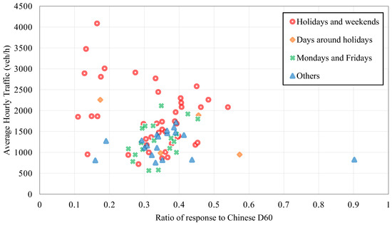 The 86 extreme response scenario samples that achieved extreme response values during the daytime mentioned above were further analyzed. For these samples, the ratio of extreme traffic response to the modeled traffic load in the Chinese D60 code were calculated, and simultaneous hourly traffic volumes were counted, as plotted in Figure 4. The attributes of each extreme response scenario sample are identified with a marked shape. For example, circles indicate that the samples belong to holidays and weekends. The results reveal that extreme response scenarios with high hourly traffic flow typically have low ratios. The highest hourly traffic flow is 4083 veh/h, with a ratio of the response value to the Chinese code D60 of only 0.165. Nonetheless, higher hourly traffic volumes pose a potential risk for congestion in a free traffic flow scenario.