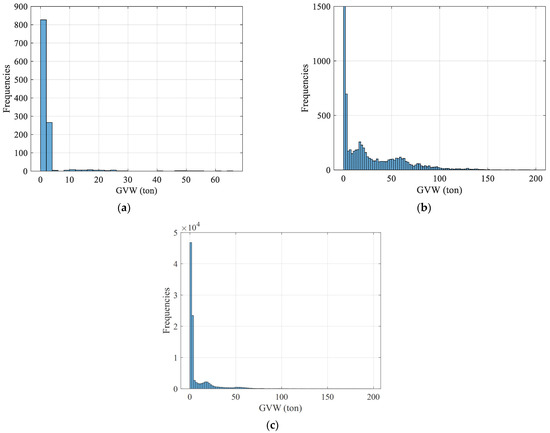 To examine the traffic composition in the case of higher hourly traffic volumes, the gross vehicle weight (GVW) information associated with the extreme response scenarios of hourly traffic volumes above 3000 veh/h was obtained. For each high-traffic-volume extreme response scenario, the GVW information within one hour before and after the moment of extreme values was examined, as shown in Figure 5a. For comparison, Figure 5b shows the histogram of the GVW when the extreme response values are high. It can be seen that the GVW tends to concentrate in vehicles weighing less than 4 tonnes for high-traffic-volume extreme response scenarios (Figure 5a). Meanwhile, the number of vehicles weighing between 4 and 66 tonnes are relatively rare for high-traffic-volume extreme response scenarios but very important for high extreme responses (Figure 5b). It should be noted that the histograms in Figure 5a,b correspond to the GVW distribution for extreme response scenarios with different traffic volumes. The histogram of the GVW distribution of all the vehicles of the WIM data can be seen in Figure 5c. In comparing histograms in Figure 5b,c, it can be noticed that when the value of the daily extreme response is larger, the level of the GVW distribution in the extreme response scenario is significantly higher compared to the GVW of the global WIM data. On the other hand, when the daily extreme response is obtained with a larger traffic volume, the level of GVW distribution in the extreme response scenario is significantly smaller compared to the GVW of the WIM data (compare Figure 5a and Figure 5c).