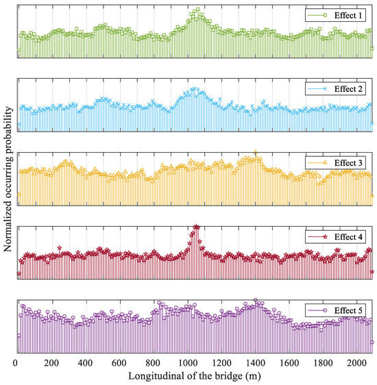 For the extreme response scenarios of the congestion flow, the probability of occurrence of vehicles in each cell on the outer lanes was counted, as shown in Figure 7. It can be seen that in the extreme response scenarios of congestion, the distribution of vehicles along the longitudinal direction of the bridge, which varies according to the load effect, is not uniform, and the vehicles tend to concentrate in the zones of the influence lines where the maximum appears depending on the load effect. Therefore, the simulation of the location of vehicles on the bridge deck can still be performed using a non-stationary Poisson distribution as in the free-flow case [33].