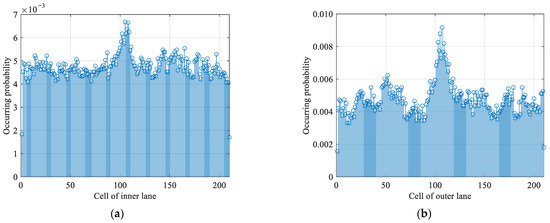 Probabilities of a cell to be occupied by a vehicle in an extreme response scenario and congested flow for load effect 1. (a) Inner lane, (b) outer lane.