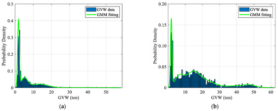 Since the distribution levels of heavy vehicle weights vary across different lanes, parameter fitting and simulation were conducted separately for the outer lanes and the inner lanes during the extreme scenario modeling process. The vehicle weight distribution shows clear multimodal characteristics that cannot be described with typical unimodal probability distribution models [27,34]. To better fit the multimodal characteristics of the weights, the Gaussian Mixture Model (GMM), which can accurately capture multiple peak attributes, was applied in this study [35].