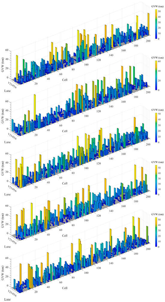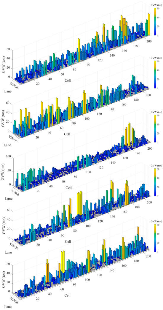 When obtaining extreme values of load effects on long-span bridges, the possible vehicle distribution on the bridge deck can vary significantly. To simulate the vehicle distribution pattern on the bridge deck during these extreme scenarios, the bridge deck was divided into cells of a certain length. Given that the number of vehicles on the bridge deck during extreme scenarios is relatively high and that lighter vehicles contribute minimally to the extreme effect values, they were omitted in the modeling process to simplify the simulation and more clearly study the distribution characteristics of heavy vehicles. To further facilitate the simulation, it was assumed that the centroid of each heavy vehicle was located at the center of the nearest bridge deck cell in the same lane. The details of the extreme response scenarios simulation method were already explained in [33]. Moreover, the driving habits of heavy vehicles also significantly impact their distribution, where heavy vehicles tend to cluster in the outer lanes. Therefore, the distribution of heavy vehicles across different lanes should be simulated during the modeling process. Two key factors needed to be considered when modeling the extreme response scenarios on the bridge deck: heavy vehicle weights and positions within the deck. They are described in the following subsections.